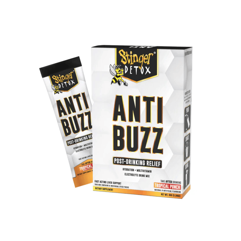 The DETOX - Stinger Anti-Buzz + Electrolytes Drink Mix 6pk is designed to help you recover quickly after drinking. Each sachet provides post-drinking relief by restoring hydration and replenishing essential nutrients lost during alcohol consumption.
